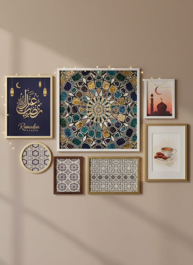 Frame Islamic geometric art or modern Ramadan prints. These can be swapped in seasonally to refresh your décor.