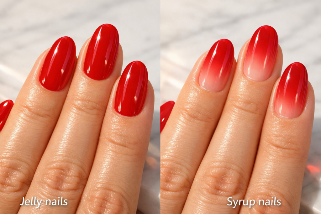 Not exactly. While both use translucent polish, jelly nails typically feature a uniform, even layer of sheer color across the entire nail. “Syrup nails” (a Korean beauty trend) use the same sheer polish but apply it in a layered gradient—starting completely sheer at the cuticle and building up opacity toward the tip of the nail.